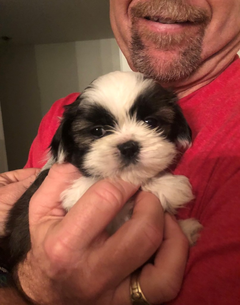 Here’s Boss as a cute little puppy, even smaller than he is now! Tom is holding him and protecting him as he grows up to be a strong, small defender of the house!